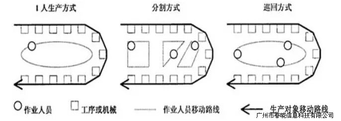 3.、巡回方式。细胞内虽然有若干名作业人员,但不再进行分工,每个人都承担细胞内的全部工序。具体操作时,作业人员按顺序排列, 跟着 在细胞内周而复始地巡回作业,在日本也称它为“追兔方式”。这种方式的优点是,可以在不增加车间作业面积,不增加工作台数量和配套设备的前提下,仅通过增加作业人员达到迅速增加产量的目的。缺点是,作业的速度受限于细胞内动作慢者的速度。